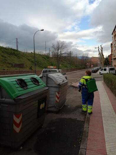 Desde que comenzaron estas labores de limpieza se han seguido las recomendaciones de desinfectar con una disolución de lejía en agua el mobiliario urbano susceptible de ser tocado, como son las barandillas o los contenedores. También se ha procedido a desinfectar en las entradas de centros de salud y supermercados.