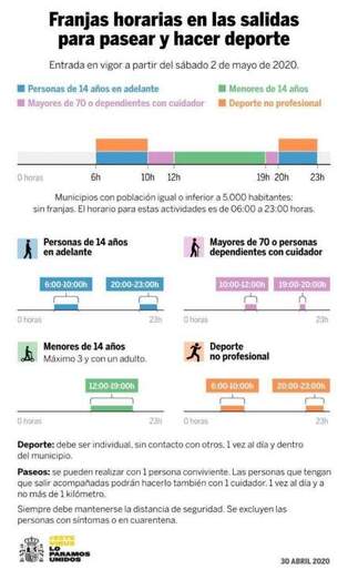 De manera separada y en atención a su especial vulnerabilidad, se definen específicamente las franjas de 10:00 a 12:00 horas y entre las 19:00 y las 20:00 horas para los paseos de personas con necesidades especiales o de mayores de 70 años, con el objetivo de separarles, particularmente, de las salidas de los niños.