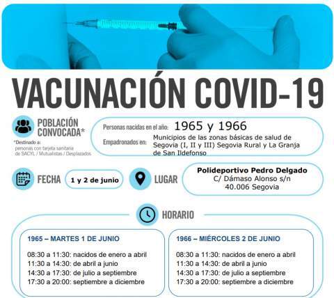 La Gerencia de Asistencia Sanitaria de Ávila ha programado para el próximo martes 1 de junio la vacunación de personas de la zona básica de salud de Arévalo nacidos en 1962 y 1963, en razón de las siguientes franjas horarias: nacidos en enero y febrero, de 9.00 a 10.00 horas; nacidos en marzo, abril y mayo, de 10.00 a 11.00 horas. Para quienes cumplan años en junio, julio y agosto, de 11.00 a 12.00 horas; nacidos en septiembre y octubre, de 12.00 a 13.00 horas, y los que hubieran nacido en los dos últimos meses del año, de 13.00 a 14.00 horas. Las personas nacidas en 1960 y 1961 que no acudieron a su llamamiento también deberán acudir el mismo día.