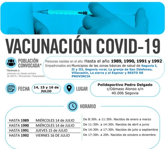 Se adjuntan en distintos correos los carteles informativos con cada uno de los llamamientos de vacunación para la semana próxima, que también están disponibles en la web de Salud de Castilla y León, en el apartado dedicado a los lugares de vacunación, pinchando en la provincia de Segovia (https://www.saludcastillayleon.es/es/covid-19-poblacion/vacunacion-covid-19).