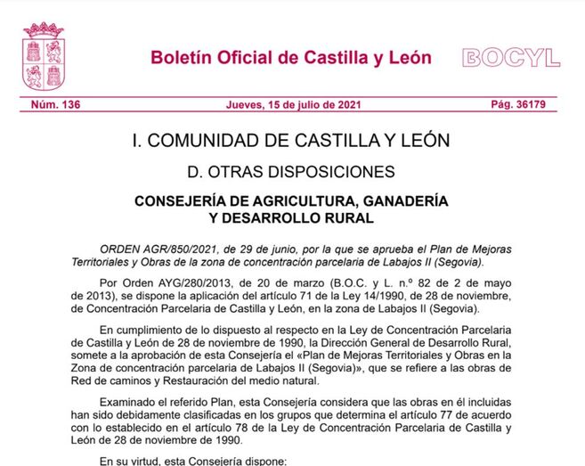 Los planes que publica hoy el Bocyl establecen las condiciones y la clasificación de las obras a desarrollar en los procesos de concentración parcelaria, que quedarán posteriormente definidas con la redacción de los correspondientes proyectos de obra, de las zonas de Los Oteros, en la provincia de León incluyendo el enclave territorial del municipio de Mayorga (Valladolid) denominado Dehesa de San Llorente; y de Labajos, situado en el extremo oeste de la provincia de Segovia.