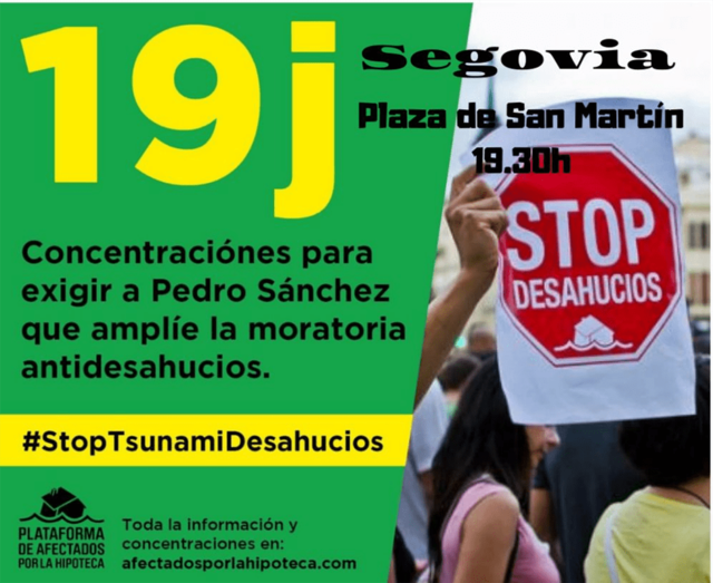 El próximo lunes 19 de Julio, a las 19.30h, en la Plaza de San Martin, Pah Segovia ha convocado una Concentración para exigir a Pedro Sánchez que amplie la moratoria antidesahucios.