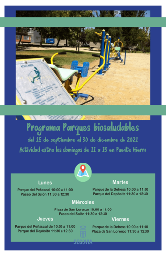El Ayuntamiento de Segovia, a través de las concejalías de Servicios Sociales y de Deportes, retoma el programa de Parques Biosaludables. Tras el levantamiento a finales de este verano de las restricciones que impedían el desarrollo de programas de ocio, vuelve a ponerse en marcha esta iniciativa en distintos barrios de Segovia con la finalidad de animar a la población (especialmente a las personas mayores) a realizar actividad física al aire libre