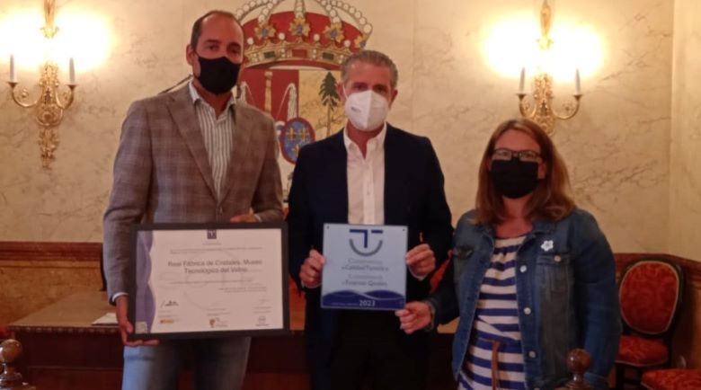 Al acto de entrega del distintivo de calidad turística ha asistido el alcalde del Real Sitio, Samuel Alonso, y la Concejala de Turismo, Paloma Ramírez, junto al Presidente de la FCNV, Andrés Ortega y el Director de la Real Fábrica de Cristales, Javier Ramos. De esta manera, el Museo Tecnológico del Vidrio podrá acreditar que se ha adherido a esta distinción de calidad.