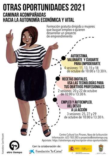 La Asociación Otro Tiempo ofrece un espacio de encuentro, desarrollo y orientación sociolaboral para mujeres en Nava de la Asunción (Segovia) A través del desarrollo de 3 talleres presenciales y gratuitos, pertenecientes al proyecto Otro Tiempo Otras Oportunidades, la Asociación Otro Tiempo ofrece la posibilidad a mujeres del medio rural que buscan empleo o emprendedoras contextualizar su búsqueda de empleo conociendo qué obstáculos tanto externos como internos podemos encontrarnos por ser mujeres y cómo desprendernos o enfrentarnos a ellos. Por ello nos propone estos talleres, que se llevarán a cabo en el Centro Cultural “Los Pinares” de Nava de la Asunción (Segovia) de 10h a 13:30h: 1. Taller de autoestima (Inteligencia emocional, empoderamiento y autocuidados): Lunes 11 , Miércoles 13 y Viernes 15 y lunes 18 de octubre. 2. Recetas digitales (uso de las tecnologías y generación de contenidos): Miércoles 20 y viernes 22 de octubre. 3. Empleo y autoempleo, del deseo a la acción (Amplía tus oportunidades, conoce alternativas): Lunes 25, miércoles 27 y viernes 29 de octubre. En estas actividades nos centraremos abordar con perspectiva de género las subjetividades, los sentires y los cuidados de las mujeres a la vez que facilitamos distintas técnicas para mejorar la empleabilidad, las invitamos a crear redes y luchamos contra la brecha digital de género. Más información e inscripciones en el tlf. 623 183 283 o el email proyectos@otrotiempo.org Noticia en la web de la asociación: https://otrotiempo.org/autonomia-economica-nava-de-la-asuncion-segovia