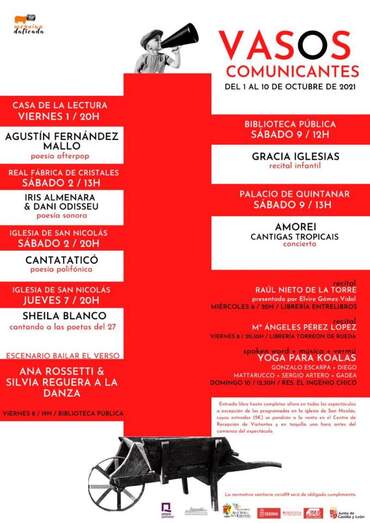 El festival de Vasos Comunicantes, organizado por Méquina Dalicada con la participación del Ayuntamiento de Segovia, se celebrará del 1 al 10 de octubre. En esta ocasión, el festival contará con dos sedes, la Casa de la Lectura y la iglesia de San Nicolás. Esta cita anual con la mejor poesía escénica en español y en todas sus corrientes, (perfopoesía, polipoesía, poesía oral, videopoesía…) irá acompañada de actividades complementarias: conciertos y recitales de poesía escénica para adultos y para niños. En concreto, La Casa de la Lectura inaugura el festival el 1 de octubre a las 20:00 horas con la actuación de Contra Mundum recitación de poemas de Agustín Fernández Mallo en formato spoken word (texto, música y vídeo).