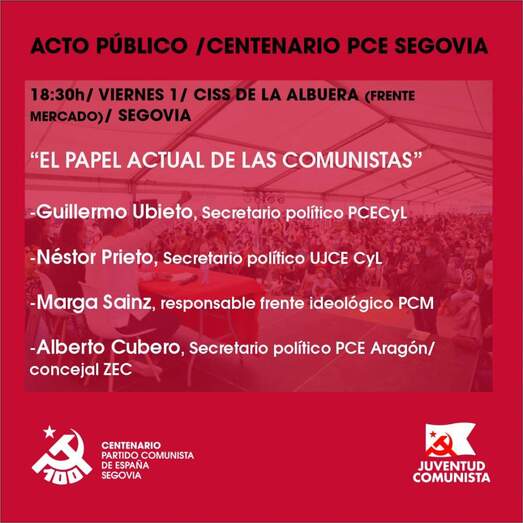 El Partido Comunista en la provincia de Segovia somete al debate el devenir centenario de un partido y un movimiento político clave en la historia de Europa y España a lo largo del SXX. En el marco de las actividades del centenario del PCE, la agrupación de Segovia ha organizado un coloquio en el que se analizará y debatirá el papel de las comunistas en el actual contexto político y social.