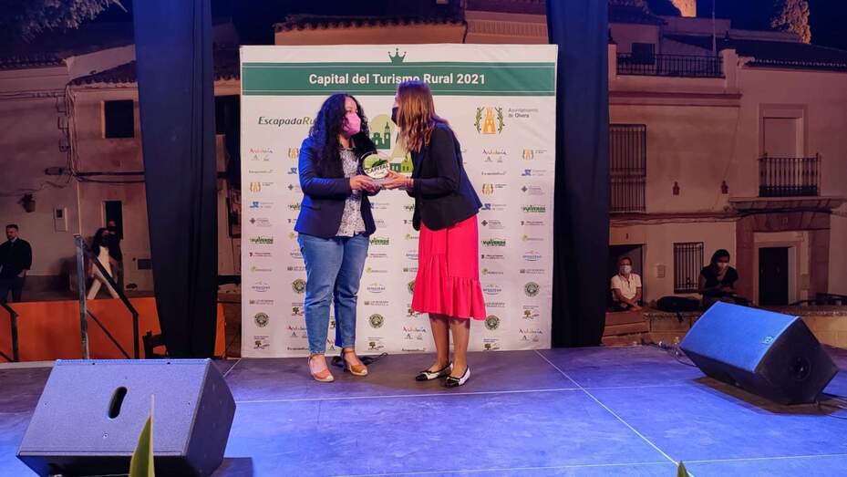 La responsable de turismo de Sepúlveda, Margarita de Frutos, recibió este fin de semana el galardón que acredita a la población segoviana como finalista de la Capital del Turismo Rural 2021. De Frutos recogió el trofeo de manos de Olivia Fontela, directora de marketing de EscapadaRural.com y promotor de la iniciativa, en un acto celebrado en la plaza de la Iglesia del pueblo gaditano de Olvera, ganador de la V edición de estos premios.