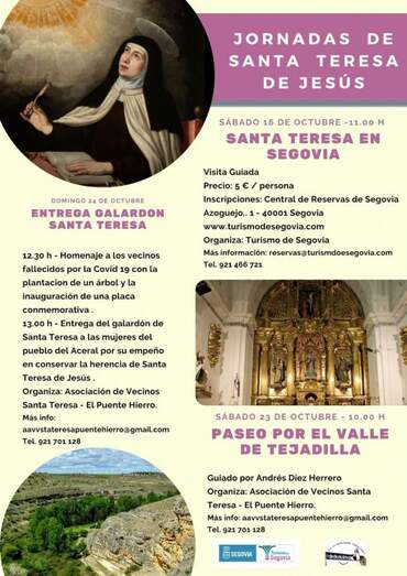Esta actividad se suma al programa de actos organizado por la Parroquia de Santa Teresa junto con la Asociación de Vecinos Santa Teresa-Puente Hierro, en el que figura, entre otras propuestas, el paseo por el valle de Tejadilla guiado por Andrés Díez el 23 de octubre a las 10:00 horas, y la entrega del galardón Santa Teresa el día 24, desde las 12:30 horas.