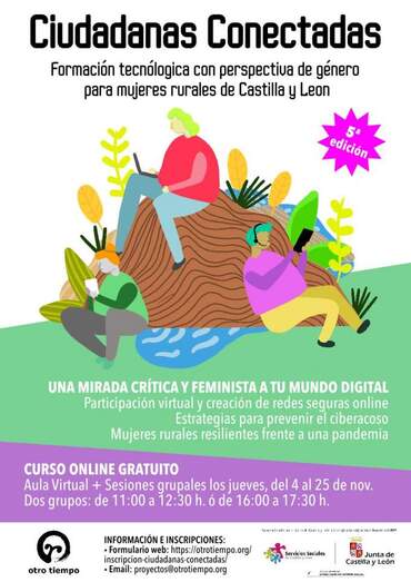 Este taller online gratuito y participativo, Ciudadanas Conectadas: Formación tecnológica para mujeres rurales de Castilla y León, incide en que las herramientas tecnológicas son también para mujeres, tengan la edad que tengan y sean de donde sean. Abarca reflexiones sobre el uso de las tecnologías desde una perspectiva de género y crítica, así como la creación de redes entre personas de toda la comunidad de Castilla y León, promocionando la participación de las mujeres de manera segura y facilitándoles herramientas para protegerse de ciberataques machistas.