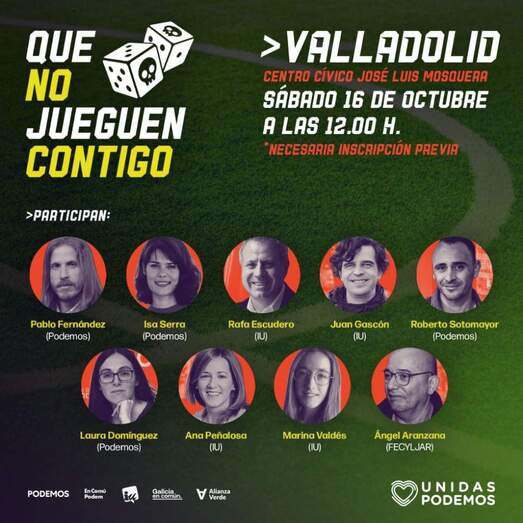 Todas las medias ya tomadas, y las aún pendientes, se reivindicarán en un acto en Valladolid de Unidas Podemos, para tomar la iniciativa y por el futuro de nuestra juventud. Para ello contamos con la presencia de Ángel Aranzana FECYLJAR y la colaboración del Ministerio de Consumo a través de Rafael Escudero, su Secretario General.