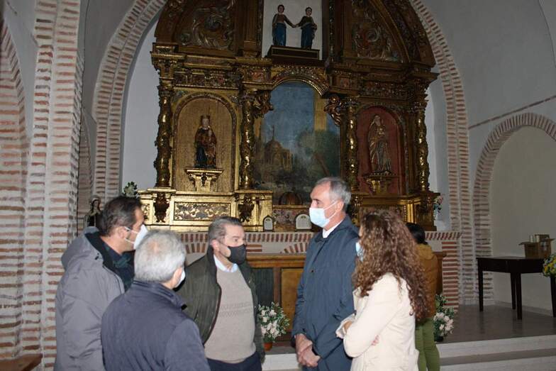 El delegado territorial de la Junta, José Mazarías, acompañado por la jefa del Servicio Territorial de Cultura y Turismo, Ruth Llorente, ha visitado hoy la ermita mudéjar del Cristo Bendito de Santa Juliana, de Navalmanzano, para conocer el resultado de la restauración del retablo barroco del templo, acometida por la Junta de Castilla y León con una inversión de 13.915 euros, cofinanciados con fondos europeos FEDER. En la visita a la ermita también han estado presentes el alcalde de Navalmanzano y diputado provincial, Pablo Ángel Torrego, representantes de la parroquia del municipio y del Obispado de Segovia y la restauradora que ha realizado los trabajos, Virginia Muñoz.