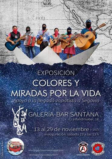 El sábado, 13 de noviembre, a las 13 horas, en la Galería-Bar Santana, se inaugurará la exposición “Colores y Miradas por la Vida”, organizada por el Ateneo Libertario y el Foro Social de Segovia, con el objetivo de apoyar y difundir la Gira Zapatista por la Vida que está recorriendo más de treinta países de Europa, con una parada prevista en Segovia.