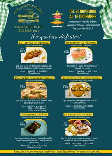 6 establecimientos hosteleros del municipio de participan en la ruta gastronómica Palazuelos de Eresma 2021 . El objetivo de esta iniciativa desarrollada por la Concejalía de promoción económica a través de la agencia de desarrollo local es atraer la atención de vecinos y turistas hacia el Palazuelos de Eresma más culinario, el del producto de calidad, el de la excelencia en los fogones y el de la cocina con personalidad y, para hacerlo.