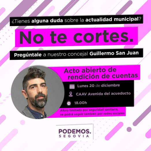 Como una muestra más de su compromiso con la transparencia, la participación ciudadana y el contacto directo con la ciudadanía segoviana, Podemos Segovia organiza un encuentro abierto el próximo lunes 20 de diciembre en el que el portavoz de la formación morada, Guillermo San Juan, rendirá cuentas de su trabajo en el ayuntamiento, aclarará las dudas sobre la actualidad municipal que se puedan plantear y atenderá a las sugerencias que los vecinos y vecinas quieran plantear para el trabajo institucional en el consistorio de los próximos meses. Este acto de rendición de cuentas se realizará en el CAAV Avenida del Acueducto a las 18.00h cumpliendo todas las medidas de seguridad y aforo, y se retransmitirá también de forma telemática. El encuentro está abierto a todos los segovianos y segovianas que quieran participar, realizar consultas o aclarar dudas sobre la actualidad municipal.