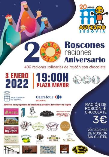 El lunes 3 de enero a las siete de la tarde, en la Plaza Mayor, si las circunstancias de la pandemia lo permiten, se celebrará el primero de los actos de conmemoración del veinte aniversario de la asociación. Con la colaboración de veinte pastelerías y panaderías de Segovia y provincia y con el ambiente festivo previo a los Reyes Magos, se repartirán 400 raciones de roscón y chocolate elaborado por la asociación de cocineros de Segovia con los productos donados por Carrefour; el precio de la ración de roscón y el chocolate será de 3€ y 20 de las raciones serán sin gluten.