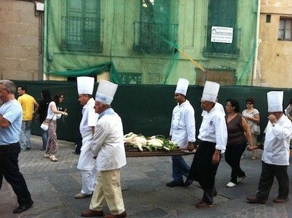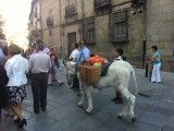 Los miembros de las distintas asociaciones e instituciones, ataviados con trajes típicos segovianos, partieron desde el Azoguejo con sus ofrendas en forma de frutas, verduras, cochinillos, dulces… que serán posteriormente repartidas por las organizaciones asistenciales de la ciudad.