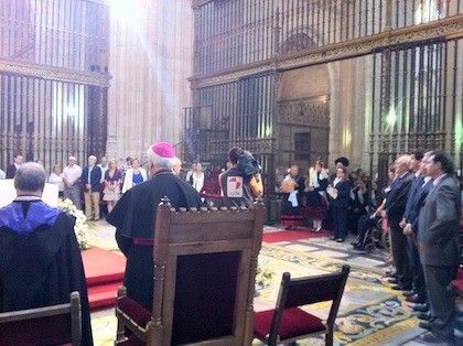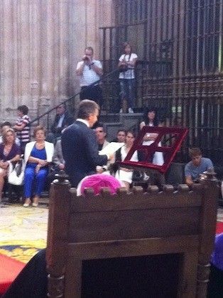 A su llegada a la Plaza Mayor, recogieron al alcalde y miembros de la corporación municipal, así como a Pedro Palomo. Y juntos se dirigieron a la Catedral. Ya en la Seo, la organizadora del acto, María Dolores Loranca, dio paso a un Pedro Palomo emocionado y que no dejó de recordar los duros momentos que se atraviesan.
