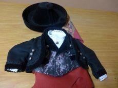Por último, el sombrero es de cono truncado y ala ancha, de paño de lana y terciopelo, borla de lana y barbiquejo de seda; el pañuelo es de viscosa y la faja de tejido de lana.