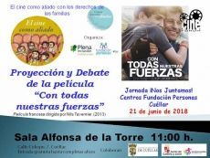 Dentro de la Jornada, a las 11:00 h. en la Sala Cultural Alfonsa de la Torre, inauguración de la Jornada por parte del Presidente de APADEFIM y secretario de Fundación Personas, D. Maxi Viloria, seguido realizaremos un Cine Fórum, (abierto a todo el público hasta completar aforo), proyectaremos la película “Con todas nuestras fuerzas”.