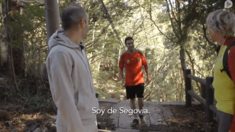 La casa está justo al lado del bosque, donde comienza la subida. Subí lo más rápido que pude por la ruta que suponía que iban a coger ellos hasta que finalmente les vi al fondo subiendo unas escaleras, después de 450 metros de desnivel al límite de mis fuerzas (ellos subieron hasta ese punto 150 metros de desnivel andando). No tenía la intención de salir en la tele, solo quería verlos y darle la cecina a Jesús, pero coincidió que cuando les alcancé estaban grabando y estuve charlando con ellos en cámara, y aproveché para darle el regalo. No preparé nada de lo que iba a decir, pero lo primero que quería dejar claro es que era de Segovia. Después seguí subiendo y les esperé arriba, donde me pude hacer una foto y que Iniesta me firmara la camiseta. Mi sueño sería algún día participar en alguna de las aventuras de Jesús Calleja, es un ídolo para mí.
