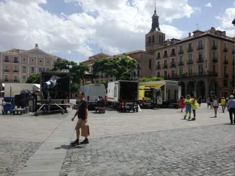 La Plaza Mayor y la Travesía del Patín de Segovia son los escenarios donde se rueda todo el día de este miércoles, 24 de julio, la serie de Movistar+ ‘Dime quién soy’. Se trata de la primera producción internacional de Movistar+ y está basada en el libro de Julia Navarro, según han informado a 'SegoviaDirecto.com' desde la Segovia Film Office.