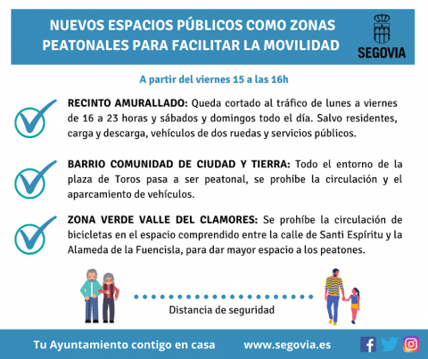 El Ayuntamiento de Segovia va a incorporar, en estos momentos, algunos espacios públicos de la capital, como zonas peatonales, para facilitar que los ciudadanos puedan guardar la distancia de seguridad (2 metros) durante sus salidas a la calle, dentro de sus respectivas franjas horarias para pasear (paseos) y hacer ejercicio físico individual entre las 6:00 y las 10:00 horas y las 20:00 y las 23:00 horas. Las personas que necesiten salir acompañadas y los mayores de 70 años lo podrán hacer 10:00 a 12:00 horas y de 19:00 a 20:00 horas (según Orden SND/380/2020). Y los menores de 14 años lo podrán hacer (en las mismas condiciones que hasta ahora) de 12:00 a 19:00 horas (según Orden SND/370/2020).