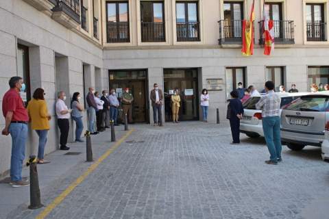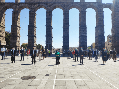 Segovia ha guardado este miércoles, a mediodía, un sentido minuto de silencio en memoria de los fallecidos por la pandemia de COVID19. Respetando las medidas de seguridad, dentro del duelo de diez días de luto oficial decretado por el Gobierno de España, la Plaza del Azoguejo ha acogido el acto con la presencia de representantes de las autoridades civiles y militares locales, además de los ciudadanos que se han querido sumar a esta convocatoria. Unidos han dedicado un momento solemne, sincero  y de respeto a la memoria de todas las personas fallecidas por la pandemia. Especialmente emotivo ha sido el minuto de silencio guardado en el Hospital de Segovia, testigo directo de tantos fallecimientos y tanto dolor como ha provocado el coronavirus en esta tierra. Los silenciosos homenajes se han replicado por distintos lugares de la capital y la provincia.