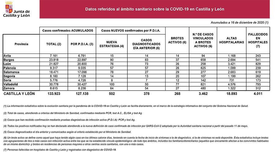 Castilla y León notifica hoy 502 nuevos casos de la enfermedad COVID-19, con lo que su número acumulado es 133.923; de esa cifra, 127.138 positivos tienen diagnóstico mediante pruebas de infección activa (*).