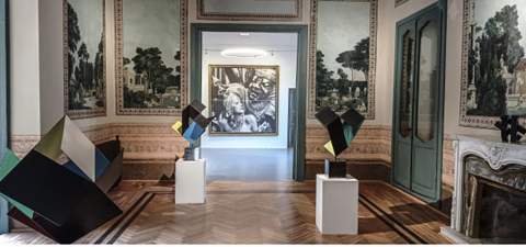 En el taller de pintura: estanterías divisorias, mesas, taburetes, pizarra, caballetes.