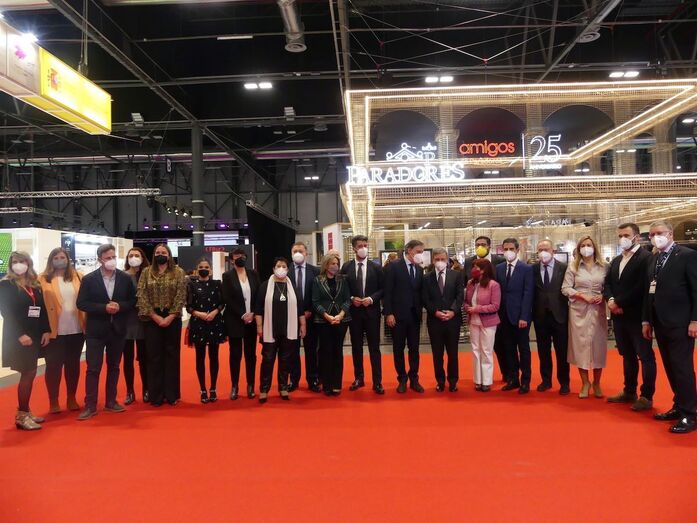 El stand de Paradores de FITUR ha sido el escenario de la foto de familia de los alcaldes y alcaldesas del Grupo, junto con el presidente de la entidad, Pedro Saura.