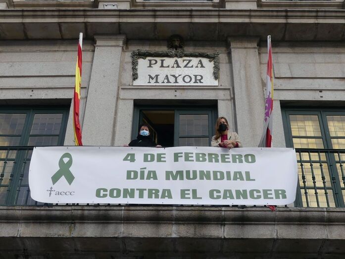 El balcón del Ayuntamiento de Segovia luce una pancarta para recordar a la ciudadanía la conmemoración del ‘Día Mundial contra el Cáncer’.