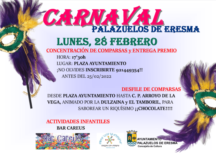 La Concejalía de Cultura del Ayuntamiento de Palazuelos de Eresma, en colaboración con la Asociación de Madres y Padres del CEIP Atalaya y el Bar Careus, prepara la celebración del Carnaval 2022. Tras el parón de la pandemia, el municipio segoviano trata de volver poco a poco a la nueva normalidad (aún son precisas algunas medidas preventivas), con diferentes propuestas como: la apertura de los Espacios Municipales, el inicio de la Temporada de Circuitos Escénicos de Castilla y León que tendrá lugar este domingo o la celebración de Carnaval en el municipio. En este último caso, se realizará un concurso de comparsas de Carnaval para lo cual será preciso inscribirse en el Ayuntamiento antes del 25 de febrero. El lunes 28 de febrero a partir de las 17’30 horas tendrá lugar la concentración de Comparsas de Carnaval en la Plaza del Ayuntamiento. El jurado valorará tanto el disfraz como las aportaciones (coreografías, coplas,..) que cada una podrá poner en escena durante su presentación y acto seguido se entregará el premio por cortesía del AMPA CEIP Atalaya. A continuación, se desfilará hasta las inmediaciones del C. P. Arroyo de la Vega, con la animación de la dulzaina y el tamboril, donde los participantes podrán degustar un sabroso chocolate. En esa misma jornada, el Bar Careus, celebrará una fiestas de Carnaval para los más peques con diferentes talleres de animación. Desde la organización confían en que la jornada permita el disfrute de todos los vecinos y sea el comienzo de la vuelta a la participación, la vida social, el encuentro,…