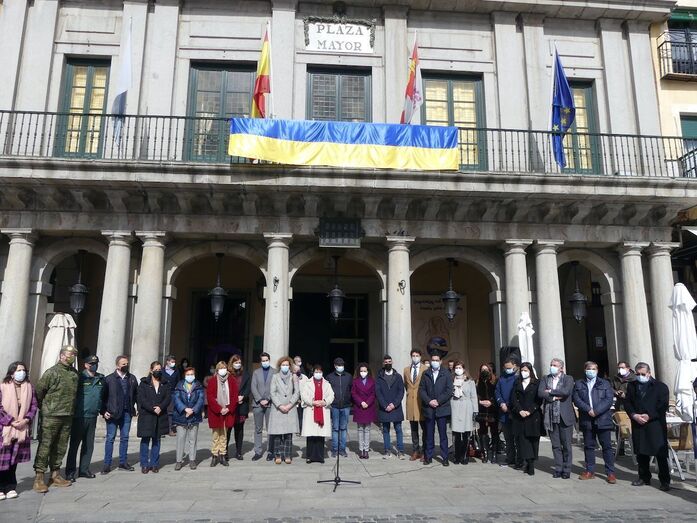 Decenas de ciudadanos y representantes de las instituciones segovianas acuden a la convocatoria del Ayuntamiento de Segovia para expresar su apoyo al pueblo ucraniano, víctima de la barbarie de la guerra por la invasión rusa y sumido en un éxodo masivo para huir de las bombas.