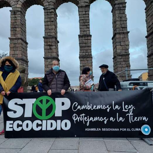 A los pies del acueducto de Segovia, el día 25 de marzo tuvo lugar una concentración presidida por una pancarta en la que se pedía STOP ECOCIDIO. “Cambiemos la ley. Protejamos la Tierra” firmada por la Asamblea Segoviana por el Clima. En la misma se defendía el manifiesto que recogemos a continuación y se distribuyó entre la ciudadanía información escrita sobre el tema. Información más detallada sobre esta acción global internacional puede encontrarse a continuación Cambiemos la ley.