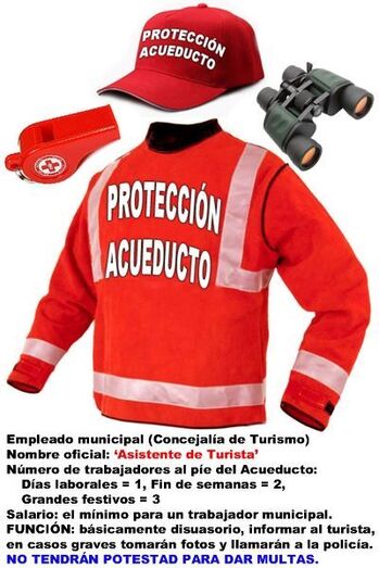 Y tiene muchas mas. La que en estos días nos ofrece Mr. Murray, ese ciudadano tan conflictivo como verdadero amante de Segovia. Para él, es ese microvandalismo muchas veces inconsciente, el responsable del grave deterioro de la parte inferior de nuestro acueducto. Frente a la amenaza de multas que están considerando las autoridades, él propone una dotación de vigilantes (uno para diario y dos para fines de semana y festivos) que llamarían la atención de las personas que no respetasen unas señales internacionales de prohibición de tocarlo de factura coherente con el monumento y empotradas en el suelo. Solo ante el empecinamiento del infractor o la gravedad de su acción avisarían a la policía. Unas cámaras se ocuparían de la vigilancia nocturna. Pues ya lo saben.