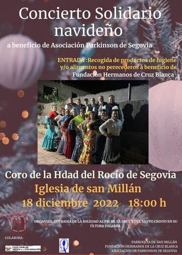 La Cofradía de la Soledad al Pie de la Cruz y el Santo Cristo de la Última Palabra, como cada año, quiere hacer un acto de caridad, y con la colaboración del Coro de la Hermandad del Rocío celebrará un concierto de Villancicos en el que se recogerán productos de higiene y alimentos no perecederos a favor de los hermanos de la Cruz Blanca.