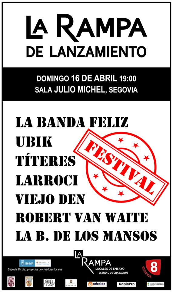 El FESTIVAL “LA RAMPA DE LANZAMIENTO” supone una apuesta contundente por la creación local en el que participarán grupos y solistas vinculados a Segovia. Un total de 7 actuaciones de 15 minutos que se irán solapando en un novedoso y experimental formato. Será, en definitiva, un espectáculo dinámico, luminoso, único en su forma y concepto, donde se aprovecharán todos los recursos técnicos de la sala multiusos Julio Michel. Además será grabado en audio y vídeo y emitido por La 8 TV y RR.SS.