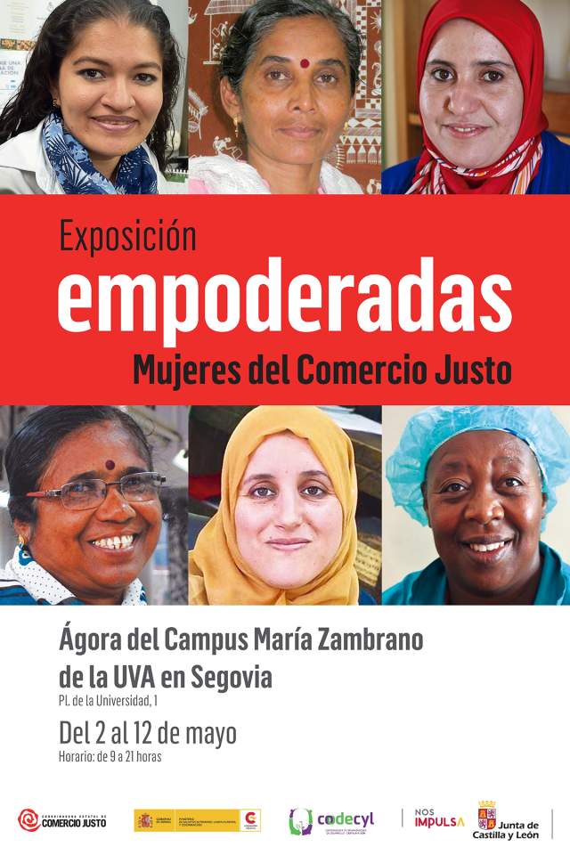 Con motivo de la celebración el próximo día 13 de mayo del Día Mundial del Comercio Justo, entre el 2 y el 12 de mayo, el Ágora del Campus María Zambrano de la UVA en Segovia acogerá la exposición fotográfica Empoderadas. Mujeres del Comercio Justo. La muestra incluye fotografías y testimonios de trabajadoras de cooperativas de Comercio Justo de Marruecos, Nicaragua e India. En ella se da a conocer cómo favorecer el empleo de las mujeres, contar con ingresos dignos, estables e igualitarios, y fomentar su participación social consolidan su independencia económica y empoderamiento personal. Además, contribuye a romper con los roles de género y al avance en la necesaria igualdad de género.