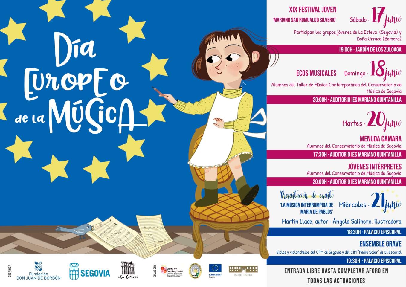 La Fundación Don Juan de Borbón, adscrita al Ayuntamiento de Segovia, y la Asociación Cultural La Esteva, celebran conjuntamente el Día Europeo de la Música, con una programación que se extenderá entre el sábado 17 y el miércoles 21 de junio. La conmemoración incluye la presentación del cuento “La música interrumpida de María de Pablos”, escrito por Martín Llade e ilustrado por Ángela Salinero, y diversas actuaciones de jóvenes músicos y danzantes, provenientes de segovia, El Escorial y Zamora.
