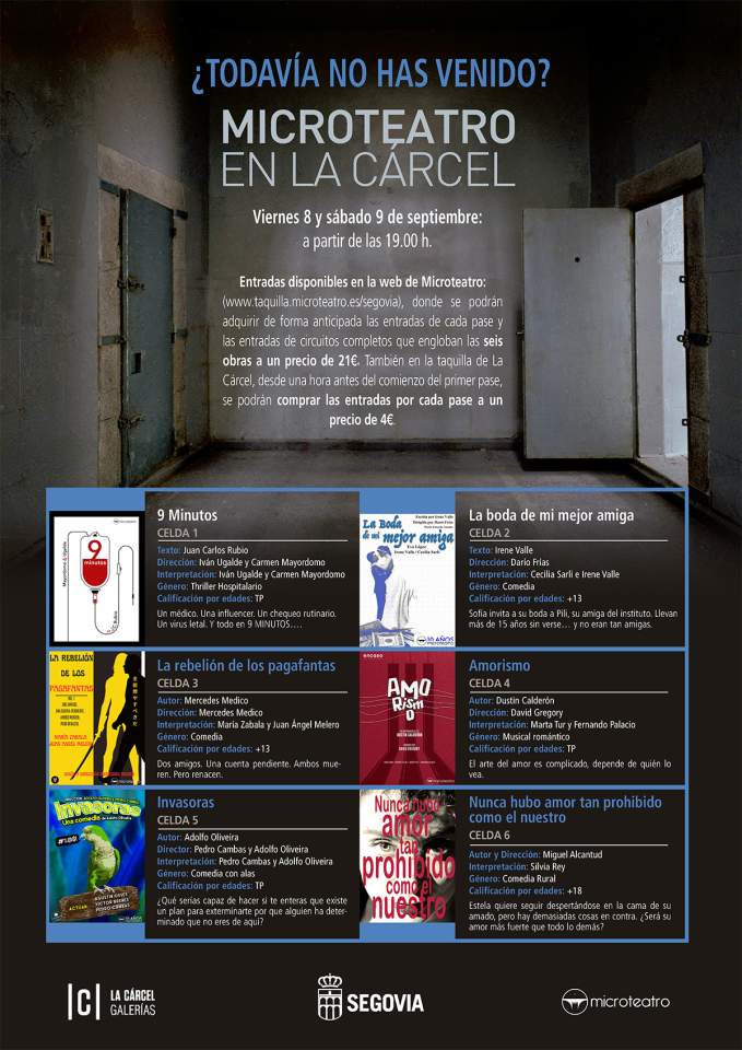 La Cárcel-Centro de Creación acoge este viernes 8 de septiembre y el sábado 9 un nuevo ciclo de Microteatro en la Cárcel, una iniciativa puesta en marcha por el Ayuntamiento de Segovia, en colaboración con la madrileña sala “Microteatro por Dinero”, que celebra este año su décima edición.