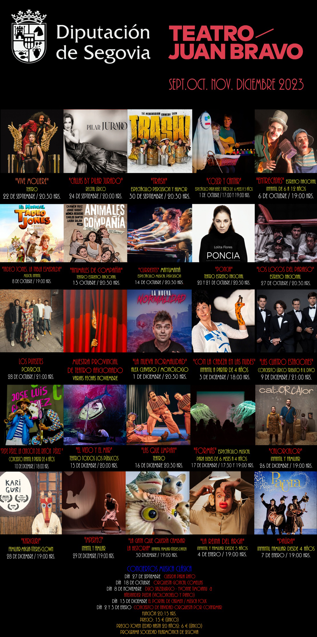 Si hay un público que va a poder presumir de una programación hecha a su medida en el primer trimestre de la nueva temporada del Teatro Juan Bravo de la Diputación ese es el familiar, al que se ha querido hacer un importante guiño en un calendario que no sólo estará presente en la programación navideña. Y es que, entre los meses de septiembre de 2023 y enero de 2024, en el espacio cultural más importante de la provincia -que, como es habitual, abrirá sus puertas de manera ‘extraoficial’ al Hay Festival antes de iniciar su curso oficial- abundarán, tanto los espectáculos musicales destinados a un público intergeneracional, como las obras de teatro dirigidas a pequeños de diferentes edades.