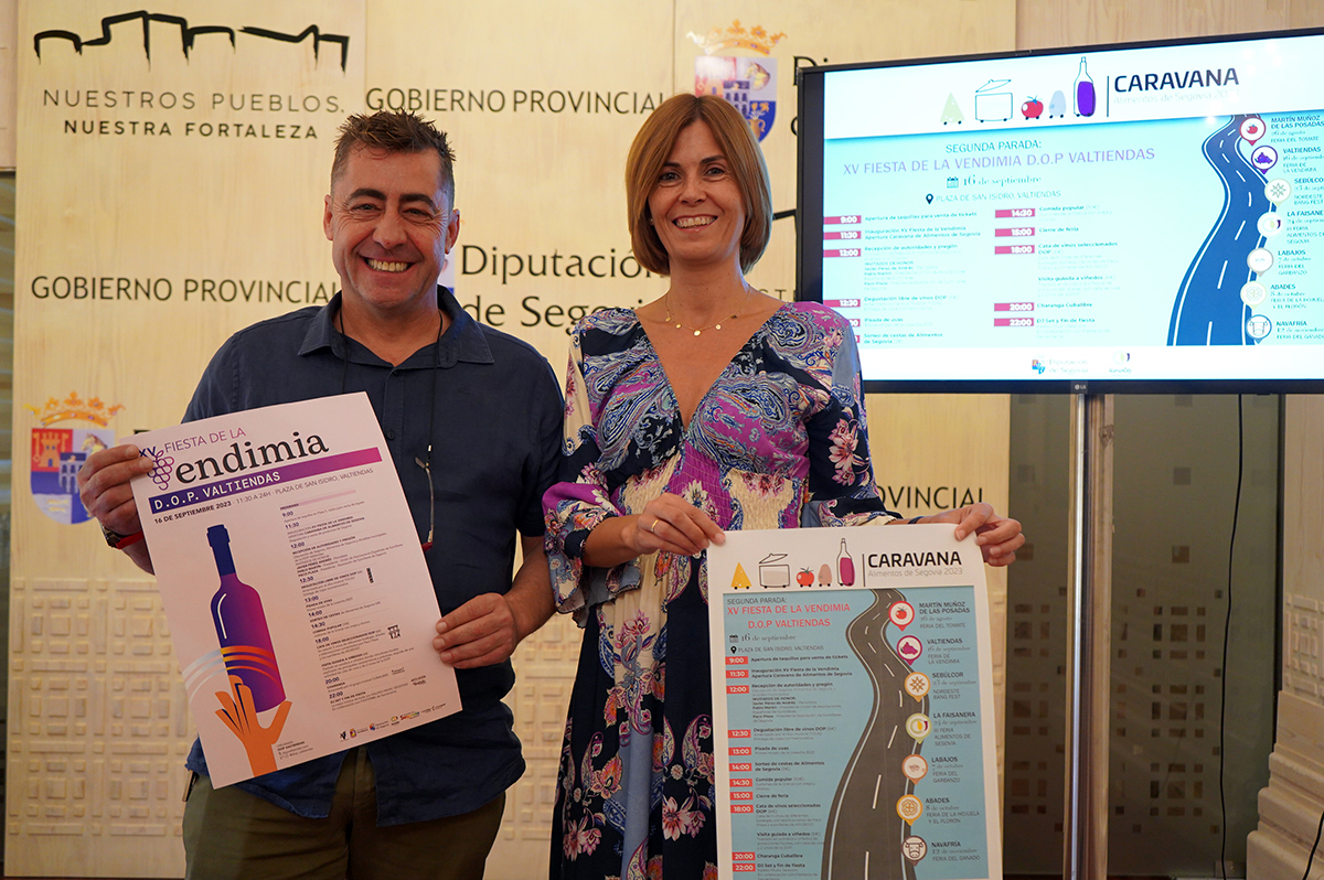 Después de iniciar su marcha en Martín Muñoz de las Posadas y su Feria del Tomate, la Caravana de Alimentos de Segovia hará parada un año más en Valtiendas, donde el próximo sábado, 16 de septiembre, tendrá lugar la decimoquinta edición de la Fiesta de la Vendimia, que ha sido presentada hoy en rueda de prensa por la diputada de Promoción Provincial y Desarrollo Rural Sostenible, Magdalena Rodríguez, y el alcalde del municipio, José María Galindo, quien es también el presidente de la Denominación de Origen Protegida.