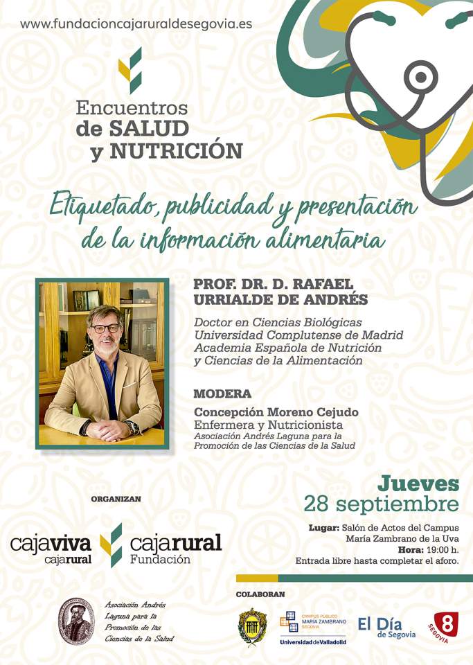 A estos efectos, la Asociación Andrés Laguna para la Promoción de las Ciencias de la Salud y la Fundación Caja Rural de Segovia, con la colaboración inestimable de la Universidad de Valladolid han programado para el próximo día 28 de Septiembre uno de sus ya habituales y concurridos “Encuentros de Salud y Nutrición” bajo el lema “Etiquetado, publicidad y presentación de la información alimentaria”, que se celebrará a las 19 horas en el salón de actos del Campus María Zambrano, Universidad de Valladolid, Segovia.