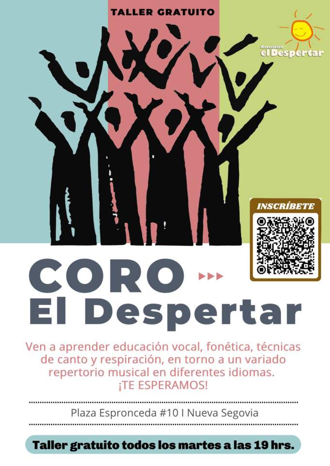 El Taller de Canto y Coro será impartido cada martes a las 19:00 horas en la sede de la Asociación, ubicada en Plaza Espronceda 10, en el barrio de Nueva Segovia. Las inscripciones están abiertas y son totalmente gratuitas.