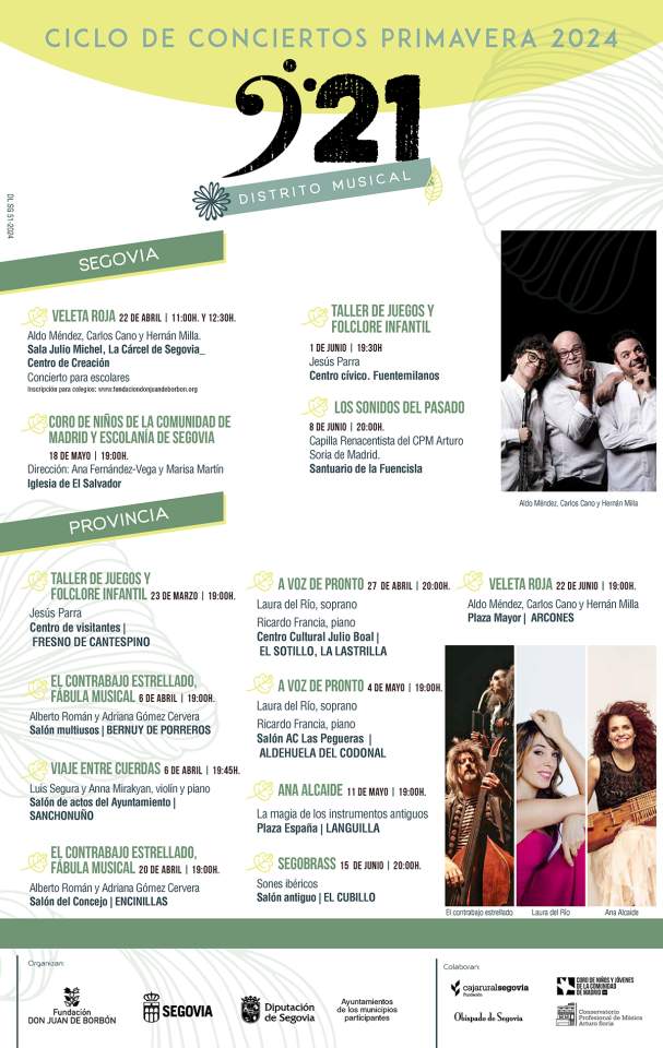 El ciclo ‘921 Distrito Musical’ creado por la Fundación Don Juan de Borbón, adscrita al Ayuntamiento de Segovia, y que organiza junto a la Diputación Provincial, incluye 13 conciertos en su edición de primavera. El ciclo se desarrollará entre el 23 de marzo y el 22 de junio, en la capital segoviana y en nueve pueblos de la provincia.