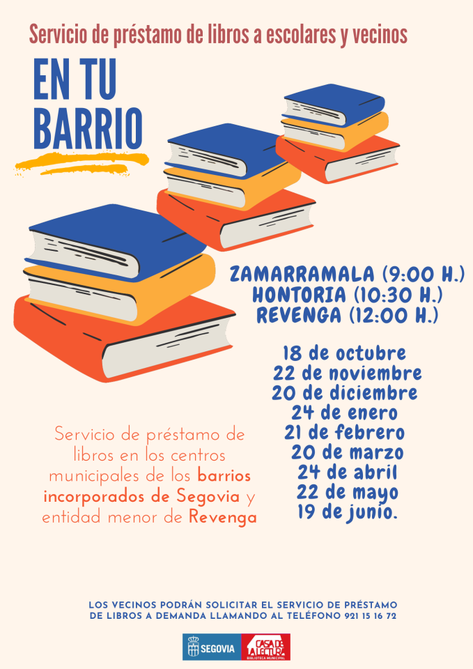 Préstamo de libros en barrios incorporados de Zamarramala (9:00 h.), Hontoria (10:30 h.) y Revenga (12:00 h.). Los vecinos podrán solicitar el servicio de préstamo de libros a demanda llamando al teléfono 921 15 16 72.