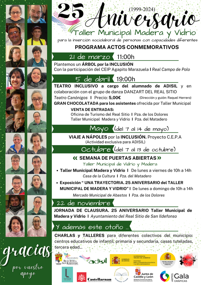 El próximo 21 de marzo arranca la programación prevista para conmemorar los 25 de años de la creación del Taller Municipal de Madera y Vidrio, promovido e impulsado por el Ayuntamiento del Real Sitio de San Ildefonso. Se llevará cabo la plantación de “Árboles por la inclusión” (11:00h) en el Real Campo de Polo, una actividad en la que colaboran diferentes colectivos e instituciones del municipio.