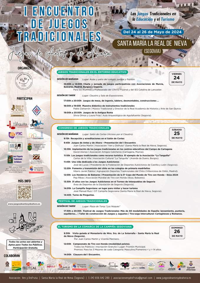 Juan Carlos Martín junto a su Asociación “Ven y Disfruta”, organizadores del evento, nos cita al I Encuentro de Juegos Tradicionales “Juegos de Antes y de Ahora” – Los Juegos Tradicionales en la Educación y el Turismo”, que se desarrollará en la localidad segoviana de Santa María la Real de Nieva, en plena Campiña Segoviana, del 24 al 26 de mayo de 2024.