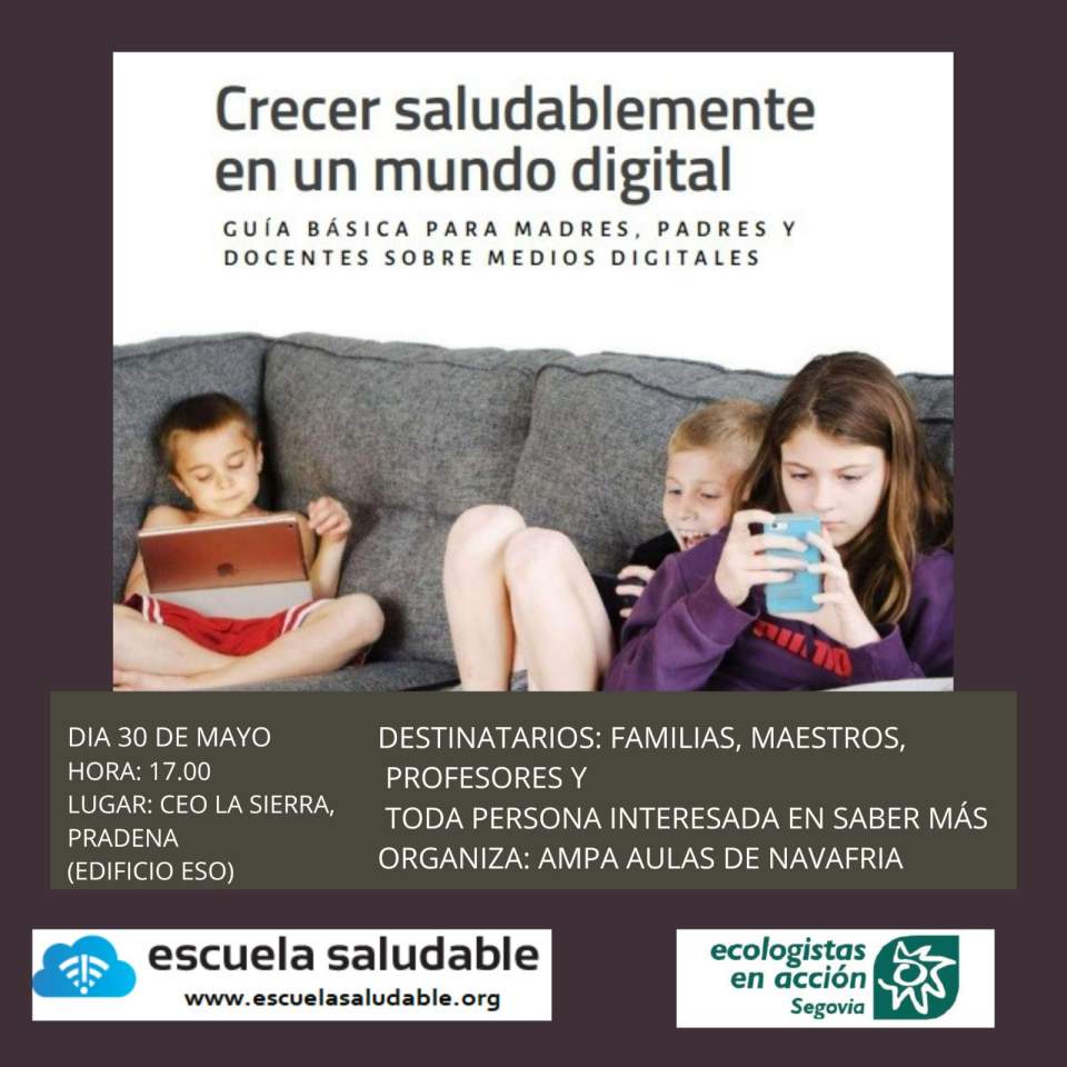 El jueves 30 de mayo a las 17 horas tendrá lugar la Charla-debate "Crecer saludablemente en un mundo digital" en el CEO La Sierra de Prádena, Segovia. Está organizada por el AMPA del colegio de Navafría, y se inscribe en el programa “Escuela Saludable” de Ecologistas en Acción.
